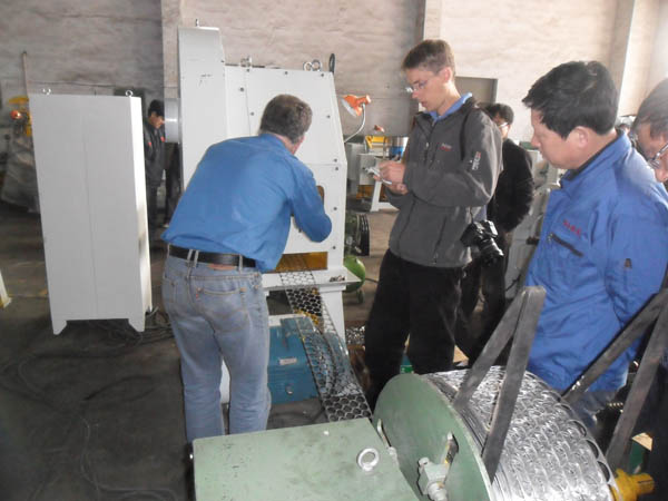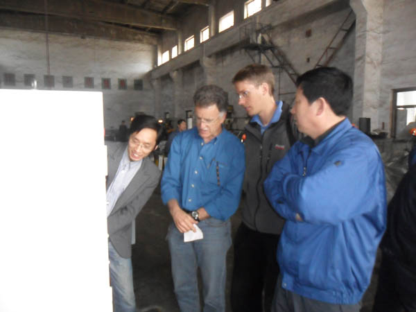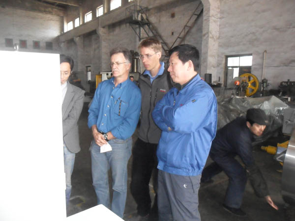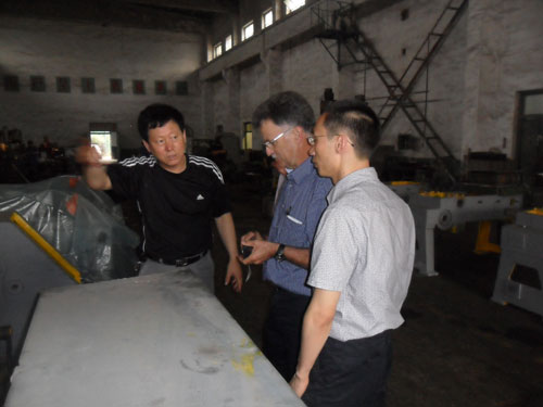 阜新匯新機械有限公司領(lǐng)導與國外客商溝通匯新多功能臥式?jīng)_床的特點。